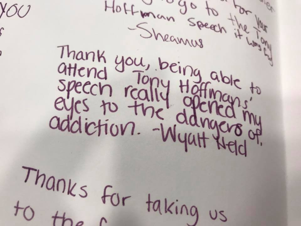 Our organization has been fortunate to bring former BMX pro athlete Tony Hoffman to Watertown twice now to speak to local students about the dangers of addiction and how one choice can change your life.